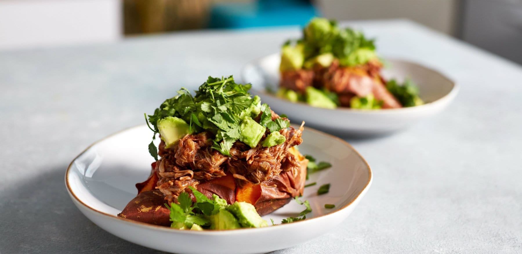6. Täytä bataatit BBQ-jakkihedelmällä, avokadolla ja korianterilla – täydellinen vegaaninen ateria on valmis