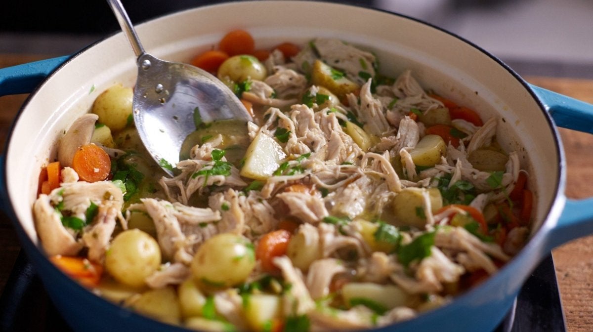- Lisää pienet perunat, kanaliemi, timjami ja mausta sitten suolalla ja pippurilla. Sekoita hyvin ja lisää kanafileet takaisin pataan.