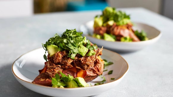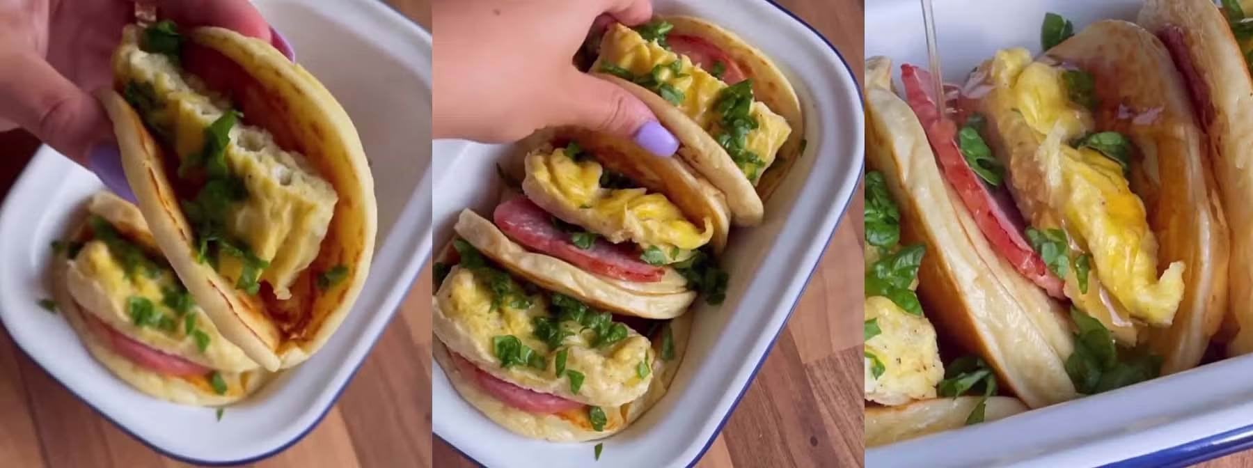 - Taita pannukakut tacot mallisiksi ja aseta ne tarjoiluastiaan. Laita päälle kalkkunapekonia, munakokkeli ja hienoksi leikattu pinaatti.