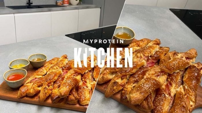 - Ripottele cheddar-juustoa lehtitaikinan päälle ja järjestele sitten pekonisiivut juuston päälle. Jätä pieni rako pekonien väliin, jotta ne eivät mene päällekkäin.