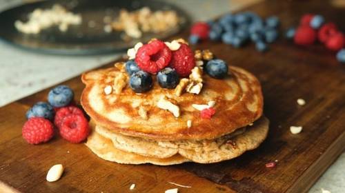 - Pinoa pannukakut lautaselle ja koristele omilla herkuilla – marjoilla, pähkinöillä ja sokerittomalla siirapilla.