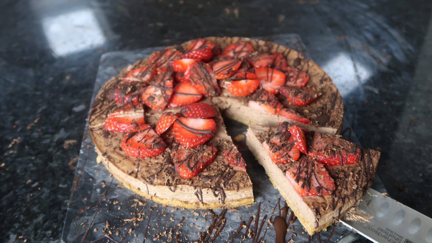 - Koristele juustokakku mansikoilla sekä sulatetulla ja raastetulla tummalla suklaalla ja sitten voit nauttia.